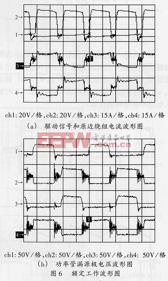 图7为在相同Io(=16A),不同Uin与不同D时原边绕组电流和箝位电容电压脉动波形图(ch3为绕组Tp1电流波形i1,ch4为绕组Tp2电流波形i2,ch1为箝位电容电压脉动Δuc波形)。实验波形充分说明了第2节环流分析和第3.1.2节中箝位电容选取原则的正确性。