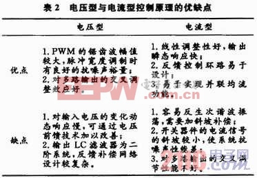为了使输出电压稳压PWM型开关电源的负反馈控制信号可以是输出电压、输出电流、输入电压(前馈)、输出电感电压以及开关器件峰值电流等。根据反馈控制信号的不同,一般分为电压型和电流型两种开关电源控制类型,其优缺点见表2所示。