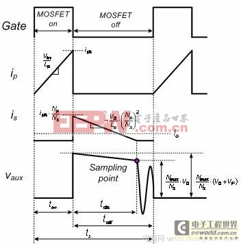 其中 LP 为变压器初级端的感量;ton 为MOSFET的导通时间;NAUX/NS 为变压器辅助绕组与次级端绕组的圈数比;VO 为输出电压;VF 为次级端输出二极管的正向导通电压。