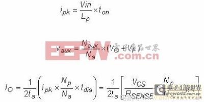 当 PSR 内部的 MOSFET 导通时 [ton],输入端电压 VIN 会建立在变压器的两端,因此变压器初级端的电流 iP 将会由零线性地上升到 ipk.;所以ipk.可以由式 (1) 推导出。在这段期间,输入端的能量会储存在变压器中。