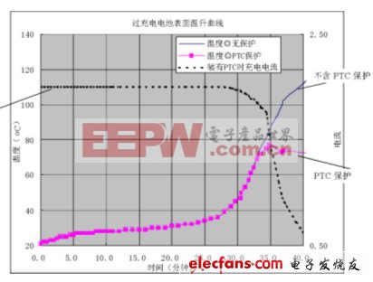 从上面的试验结果能够观察到,不带PTC 保护的电池在过充电时表面温度最高可达到接近120℃,最终引起漏液、起火甚至爆炸;而装有科特公司KT16-1750DL 型高分子PTC 的电池其表面温度不会超过80℃。