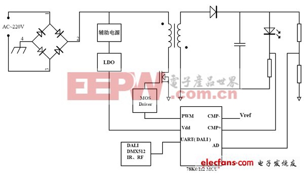 采用BOOST电源拓扑结构,输入电压经过升压后直接驱动LED灯;负载电流采样,通过嵌入算法实现恒流控制; MCU内置DALI通讯接口,通过总线和DALI 主机连接,实现和主机的相互通讯,完成上位机发出的操作控制指令;灯具温度、光照度传感器信号加到MCU端口,实现异常检测保护。
