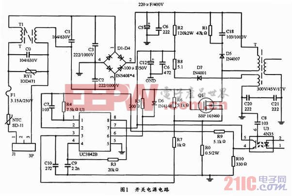 在开关电源电路中,本设计选用一块核心电源芯片UC3842。这是一种高性能,固定频率的电流型控制器,可直接驱动晶体管和MOSFET,