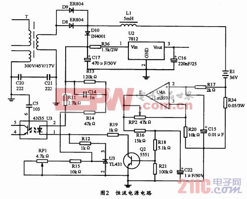该电路采用高精度运算放大器LM393为核心器件,其电路如图2所示。当该电路通电工作时,变压器次级整流输出一个电压加到电池正负级以对电池充电,电流流过电阻R34(电阻阻值为0.05Ω)时,电阻两端的电压为Ui=IoR,则Uil的电压随电压比较放大器放大,当放大到能够开启三极管Q2时, (三极管Q2工作在临界导通状态),三极管Q2将工作在放大状态,从而拉低其CE两极的电压,从而使光电耦合器耦合加强,并使UC3842的2脚电压上升,同时使调宽脉冲导通宽度变窄,从而使场效应管导通时间变短,以稳定充电电流。充电电流的大小可由RP2决定。
