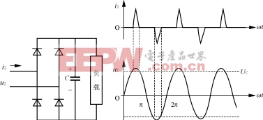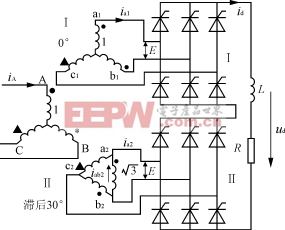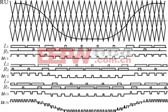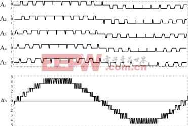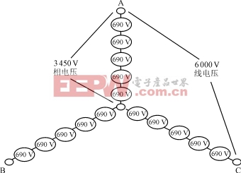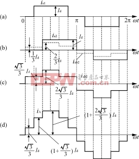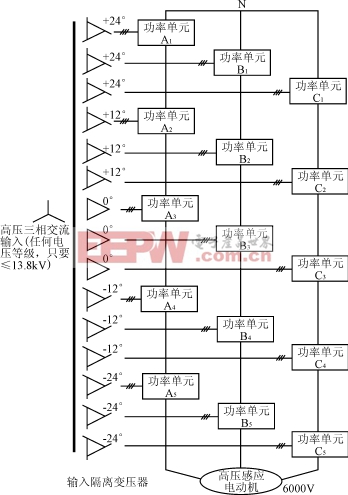 、4由通、断→断、通时,A端电压由0→-)。同理,B、C每相电压亦有+、0、-三种电平。若每相均采用PWM控制,三相3电平PWM逆变器的输出电压波形如图7(a)或图7(b)所示。其中图7(b)为输出电压滤波前后的波形。 与常规只有一个直流电压,桥臂上、下管交替通断每相输出只有+、-两种电平的逆变器相比,3电平逆变器由于输出电压电平数增加(相电压由2个增加到3个,线电压由3个增加到5个),每个电平幅值下降,同时,每周期开关状态由23=8种增加到33=27种,增加了PWM控制谐波消除算法的自由度,在同等开关频率下,可使输出波形质量有较大提高,输出dv/dt也有所减少。另外,虽然同一臂上有器件串联,由于不出现任何两个串联器件同时导通或关断,所以不存在器件动态均压问题。加之每个主开关器件所承受的电压仅为直流侧电压的一半,很适合高压大 关于中、高压变频器的一些知识 图8单元串联多电平变频器 容量的应用场合。图6(b)为变频器系统框图。顺便指出,三电平变频器的概念还可扩展到多电平,例如5电平,输出电压的台阶数更多,波形更好。在相同器件耐压下,可输出更高的交流电压,但器件的数量和系统的复杂性也大大增加了。 233多单元逆变器串联 变频器主电路如图8所示。这是一种多重化结构〔见图8(a)〕,每相由功率单元串联而成〔见图8(b)〕,每个功率单元均为三相输入、单相输出的交直交电压型低压逆变器〔见图8(c)〕。功率单元单相桥式逆变电路采用4种不同的开关模式可输出0和±1三种电平。每个单元采用多电平移相PWM控制,即同一相每个单元的调制信号相同,而载波信号互差一个电角度且正反成对。图9是3个功率单元串联、一相电压的形成波形,三角载波信号互差120°(4和5单元串联则互差90°和72°)。这样每个单元的输出便是同样形状的PWM波,但彼此相差一个角度。图10(a)是5单元串联联结后一相的输出电压波形,它有±5、±4、±3、±2、±1和0共11种电平,线电压则有21种电平,见图10(b),可以看出,它已非常接近正弦波。 采用移相PWM控制,也使叠加后输出电压的等效开关频率增加。例如,当每个单元的PWM载波频率为600Hz时,5单元串联后输出电压等效开关频率便为6kHz。一方面,开关频率的提高更有助于降低电流谐波,另一方面,由于单元内PWM载波频率较低,不仅可减少开关损耗,还可使逆变器死区时间引起的误差所占比例减少。 至于每相串联的单元数决定于输出电压等级,当每相用3、4、5个输出电压为480V的功率单元串联,变频器输出额定电压分别为2.3kV、3.3kV、4.16kV,如每相用5个690V或1275V的功率单元串联,输出额定电压可达6kV和10kV,由于采用的是单元串联,所以不存在器件直接串联引起的均压问题。 多单元串联方案线路比较复杂,功率器件数量多,如用高压(HV)IGBT,则可减少功率单元和器件的数量,例如用3.3kV的HVIGBT,则4.16kV和6kV的变频器只有2个和3个单元串联。 3整流电路 常用的整流器几乎都采用晶闸管相控整流电路或二极管整流电路,直流侧则采用电容滤波,这样就使得它们交流侧的电流呈尖峰性而非正弦波,图11为单相整流示例。大量使用由这些电路构成的装置已成为电力系统中的主要谐波源,而且消耗大量的无功功率。为此,IEC、EN、IEEE均规定了谐波标准。参考应用较为普遍的IEEE5191992,我国颁布了GB/T1454993《电能质量补用电网谐波》国标。凡不符合上述标准的电力电子设备均不允许进、出口。 对相控整流电路,当电压为正弦波、电流为非正弦波时,其功率因数λ为λ=cosφ1=νcosφ1 (b)输出线电压与相电流波形 (a)输出相电压波形 式中:P为有功功率;S为视在功率;U为正弦电压有效值;I为总电流有效值;I1和φ1分别为基波电流有效值及其与电压的相角差。一般称ν=I1/I为电流波形畸变因数,cosφ1为位移因数或基波功率因数,即这时功率因数是由电流波形畸变和基波位移两个因素决定的。v也可表示为ν=,其中THDi=为总电流畸变率,反映电流的失真程度。 因为中、高压变频器都是大容量,更必须设法减少谐波对电网的影响,并提高功率因数。目前采用的整流电路有如下几种形式。 31整流电路的一般多重化图12是二重串联联结电路。整流变压器二次绕组分别采用星形和三角形连接,构成相位互差