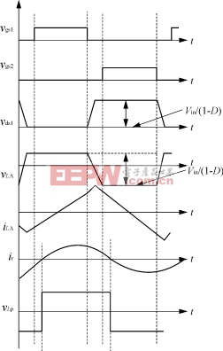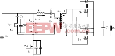 图2中,有源箝位电路和主开关管产生方波电压,其幅度随主开关管的占空比变化。这一幅度调制输入电压被加在由Lr和Cr组成的串联谐振电路上。开关频率被选在稍高于谐振频率处。由于串联谐振电路有一很高的品质因数,所以,电流的基波部分通过谐振支路,而谐波部分会被大大抑制。这样,基波部分通过变压器被输出电路整流和滤波。开关管S1和S2在留有一定的死区时间后交替导通。在死区时间内,S1和S2的寄生电容通过谐振电流Ir和电感LA磁化电流被充电和放电而实现ZVS工作。