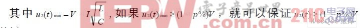 为了避免电源的纹波出现在危险区域,一般要求ω >>ωn 0 ,工程中取ω 5ωn 0 = 。此时在ωn的点,LC 电路对纹波的放大倍数为25 / 24 =1.042,放大部分不超过5%。另外根据芯片的要求,u2 的压降不能大于百分比p%,得到不等式(VI):