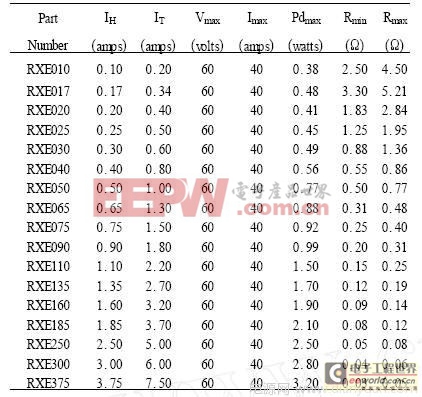 PolySwitch元件有多种系列产品,其产品特性各不相同。以常用的RXE系列元件为例,其20℃时的电气特性如表1所示。