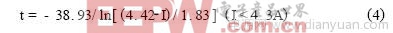 由表1可知,RXE系列PolySwitch元件所能承受的最大电流为40A。该点与临界点之间为曲线的直线部分。设动作时间为t(秒),故障电流为I(安),考虑到横轴、纵轴均为对数坐标,两者之间应具有如下数学关系: