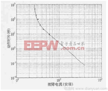 将实验数据与数学模型曲线绘制在同一坐标系中,如图2所示。图中的曲线为根据(2)式和(4)式绘制的仿真曲线,图中的点为实测数据点。为了方便比较,曲线的横轴、纵轴均采用了对数坐标,所用软件为Matlab6.0。比较图1和图2可知,该仿真曲线与PolySwitch元件手册中给出的动作保护特性曲线形态一致,且与实测数据点之间基本吻合。其他型号曲线的数学模型可按照上述方法分别建立。