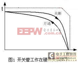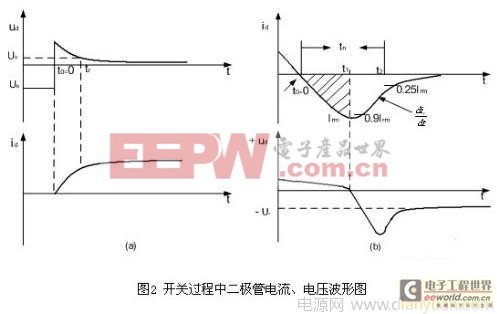 开关管工作在硬开关条件下开关电源自身产生电磁干扰的根本原因,就是在其工作过程中的开关管的高速开关及整流二极管的反向恢复产生高 di/dt和高dv/dt,它们产生的浪涌电流和尖峰电压形成了干扰源。开关管工作在硬开关时还会产生高di/dt和高dv/dt,从而产生大的电磁干扰。图1绘出了接感性负载时,开关管工作在硬开关条件下的开关管的开关轨迹,图中虚线为双极性晶体管的安全工作区,如果不改善开关管的开关条件,其开关轨迹很可能会超出安全工作区,导致开关管的损坏。由于开关管的高速开关,使得开关电源中的高频变压器或储能电感等感性负载在开关管导通的瞬间,迫使变压器的初级出现很大的浪涌电流,将造成尖峰电压。开关管在截止期间,高频变压器绕组的漏感引起的电流突变,从而产生反电势E=-Ldi/dt,其值与电流变化率(di/dt)成正比,与漏感量成正比,叠加在关断电压上形成关断电压尖峰,从而形成电磁干扰。此外,开关管上的反向并联二极管的反向恢复特性不好,或者电压尖峰吸收电路的参数选择不当也会造成电磁干扰。由整流二极管的反向恢复引起的干扰源有两个,它们分别是输入整流二极管和输出整流二极管。它们都是由电流的换向引起的干扰。由图2表明,t0=0时二极管导通,二极管的电流迅速增大,但是其管压降不是立即下降,而会出现一个快速的上冲。其原因是在开通过程中,二极管PN结的长基区注入足够的少数载流子,发生电导调制需要一定的时间tr。该电压上冲会导致一个宽带的电磁噪声。而在关断时,存在于PN结长基区的大量过剩少数载流子需要一定时间恢复到平衡状态从而导致很大的反向恢复电流。当t=t1时,PN结开始反向恢复,在t1-t2时间内,其他过剩载流子依靠复合中心复合,回到平衡状态。这时管压降又出现一个负尖刺。通常t2《t1,所以该尖峰是一个非常窄的尖脉冲,产生的电磁噪声比开通时还要强。因此,整流二极管的反向恢复干扰也是开关电源中的一个重要干扰源。