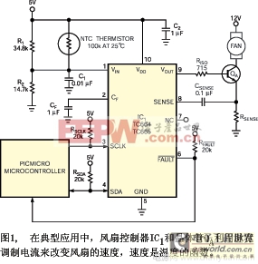 微芯科技(Microchip )公司提供一种工作于PWM模式的风扇制冷速度控制器系列产品,用于无刷直流风扇(参考文献1)。为了利用PWM波形的占空比来控制风扇速度,可以使用外部 NTC(负温度系数)热敏电阻或微芯公司的一种PIC微控制器及其 SMBus 串行数据总线。图1示出了TC664 和 TC665 控制器数据资料描述的一种典型应用(参考文献2)。利用电容值为1mF的频率控制电容器CF和风扇控制器IC1产生一个PWM脉冲串,它的标称频率为30 Hz,依赖于温度或命令的占空比变化范围是30%~100%。