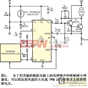 虽然使用PWM模式的控制器可以降低晶体管QA(它驱动风扇)的功耗,但 100 mA 方波电机驱动电流可能对附近的高灵敏度音频电路导致不需要的干扰。图2中的电路解决了这个问题。一个额外的驱动晶体管Q1以及一个由C3和R3组成的RC 网络构成了一个简单的PWM到线性转换器。还可以使用另一个PWM到线性转换电路,比如基于运算放大器的积分器。