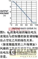 图3示出了Q2的集电极的直流电压与IC1的PWM驱动输出波形的占空比之间关系图。施加到风扇的电压对应于Q2的集电极电压和12V电源电压之间的差值。即使风扇两端出现了稳定的电压,风扇电机的换向产生的电流脉冲仍然会在连接到Q2的发射极的电流检测电阻器RSENSE两端产生一个电压,并且 IC1的所有保护和警告特性均保持可用状态。