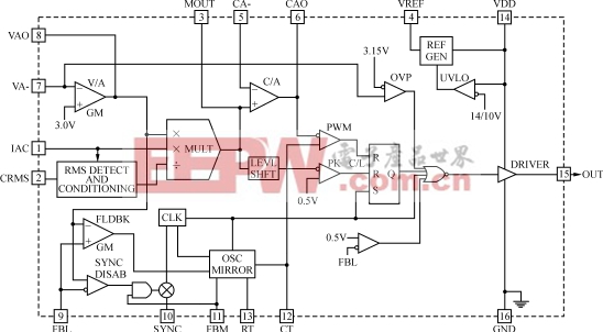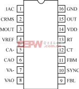 CAO(6脚):电流放大器的输出端,即一个宽带放大器的输出端。该放大器检测电网电流,并控制脉宽调制器(PWM)迫使其成为正确的电流波形。当有必要时,该输出端可关闭振幅接地,允许PWM为强迫零占空比。