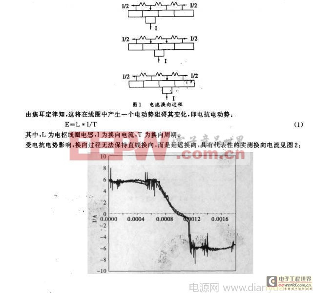 换向时,电枢电流在极短的时间内变换方向,线圈电流的换向过程由图1简示。