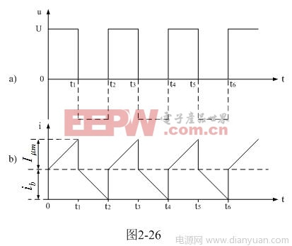 PbT= DUIb (2-84) (2-84)式中, PbT为涡流电流产生的全波平均功率;U为电源电压幅度; Ib为涡流损耗电流的半波平均值, Ib =ib ;D为输入脉冲的占空比。 从(2-83)式和(2-84)式以及(2-66)式可以看出,单激式开关电源变压器的涡流损耗功率,与输入电压脉冲的宽度成正比,与输入电压的平方成正比。 顺便指出:(2-84)式的结果,是认为涡流损耗在t1-t2期间(图2-26-b)完全等于0而求得的,但实际上,在t1-t2期间变压器初级线圈产生的反电动势同样也会在变压器铁芯中感应产生涡流损耗电流,即当输入电压为0时刻,在变压器铁芯中还存在很短暂时间的涡流损耗;由于这种涡流损耗是由反电动势提供能量来维持的,它将随着反电动势能量的衰减很快就衰减到0。 既然,涡流损耗会从反电动势中摄取一部分能量,那么,反电动势输出给负载R1的能量就会要减少同样一部分;即,涡流损耗的一部分能量被划分到磁滞损耗那边去了。因此,涡流损耗与磁滞损耗总是有点纠缠不清,要把它完全分开还是比较难的。 另外,工作于反激式输出的大功率单激式开关电源变压器,其初级线圈的电感相对比较小,因此,其励磁电流比较大,要精确测试其磁滞损耗和涡流损耗也是比较困难的。因为,如果按实际工作的条件来测试,反电动势输出的功率非常大,因此,在负载R1上损耗的功率也将很大;如果用小功率进行测试,离实际工作条件相差太远,测量出来的结果就没有实际意义。 因此,(2-81)、(2-82)、(2-83)、(2-84)式最好只用于对正激式输出的单激式开关电源变压器进行磁滞损耗和涡流损耗功率测试,因为其初级线圈的电感相对比较大,励磁电流比较小;如果需要对反激式输出的单激式开关电源变压器进行测试,最好只用于对小功率开关电源进行对比测试。 比如要对一个100瓦以上的反激式开关电源进行磁滞损耗和涡流损耗测试,我们可以用一个功率只有5瓦或10瓦的小开关电源来进行对比试验,然后把试验结果或优化措施移植到大功率开关电源之中。当然开关变压器的伏秒容量以及工作电压和频率应该基本一样,试验才会有效。