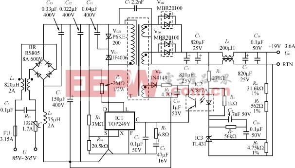TOPSwitchGX适合制作低成本、高效率、小尺寸、全密封式开关电源模块或电源适配器(adapter)。由TOP249Y构成的密封式70W(19V,3.6A)通用开关电源模块,电路如图1所示。当环境温度不超过40℃时,模块的外形尺寸可减小到10.5mm×5.5mm×2.5mm。设计的交流输入电压范围是85V~265V,这属于全世界通用的电压范围。该电源能同时实现输入欠压保护、过压保护、从外部设定极限电流、降低最大占空比等功能,其主要技术指标为: