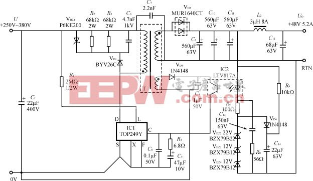 低泄漏电感的高频变压器并在初、次级之间增加屏蔽层,将漏感减至最小;第二,在钳位保护电路中的瞬态电压抑制器两端并联阻容元件R2、R3、C6,构成保护功能完善的VDZ1、VD1、R、C型钳位及吸收电路,以便吸收掉漏感上较大的磁场能量。这种设计的优点在于,正常工作时VDZ1的损耗非常小,泄漏磁场能量主要由R2和R3分担;VDZ1的关键作用是限制在起动(或过载)情况下的尖峰电压,确保内部MOSFET的漏极电压低于700V。 次级绕组电压首先经过VD2、C9、C10和C11整流、滤波,再通过L2、C12滤除开关噪声之后,获得稳定的直流输出电压UO。为减小滤波电容的等效电感,现将C9、C10和C11作并联使用。稳压管VDZ2、VDZ3和VDZ4的稳压值分别为22V、12V、12V,串联后的总稳压值UZ=46V,稳定电流IZ≈10mA。设光耦中红外发光二极管LED的正向压降为UF,输出电压由下式确定: 图2250W开关电源电路 UO=UZ+UF+UR6≈46V+1V+10mA×100Ω=48V R6是LED的限流电阻,它还决定控制环路的增益。二极管VD4和电容C14构成软起动电路。刚上电时,由于C14两端压降不能突变,致使VD6因负极接低电平而导通,此时稳压管不工作。随着C14被充电,其两端的压降不断升高,又使VD4变成截止状态,输出电压才建立起来。掉电后,C14上的电荷就经过R9泄放掉。C13和R8为高压控制回路的频率补偿元件。为了保证TOP249Y能在满载情况下正常输出,必须给TOP249Y加上面积足够大的散热器,使芯片即使在低压输入或最高环境温度下工作,芯片的最高结温也不超过110℃(仅对Y封装而言,其他封装均不得超过100℃)。若受安装条件限制,无法加装大散热器,则必须进行通风降温。 3由TOP246Y构成的45W多路输出式开关 电源 由TOP246Y构成45W多路输出式开关电源的电路如图3所示。它可作为机顶盒、电报译码器、大容量硬盘驱动器或笔记本电脑的开关电源。该电源在输入电压为交流185V~265V时,额定输出功率为45W,峰值输出功率可达60W;电源效率η≥75%,空载时的功耗仅为0.6W。五路输出分别为:UO1(5V、3.2A)、UO2(3.3V、3A)、UO3(30V、0.03A)、UO4(18V、0.5A)、UO5(12V、0.6A);它们的负载调整率依次为±5%、±5%、±8%、±7%、±7%。现将5V和3.3V作为主输出,并按一定的比例引入了反馈量,使这两路的稳压性能最佳。其余各路为辅输出。 由VDZ1、VD6、R5和C5构成的初级钳位电路,能使漏极电压在所有情况下均低于700V。R5和C5组成尖峰电压吸收电路,正常工作时可将瞬态电压抑制器VDZ1上的功率损耗降至最低,除非发生过载情况。TOP246Y具有频率抖动特性,能有效抑制噪声干扰,因此只需在输入端加简单的EMI滤波器(C1,L1,C6)并采取合理的接地措施,即可符合有关电磁兼容性的CISPR2213国际标准。刚上电时,利用热敏电阻(RT)可对C2的冲击电流加以限制,防止保险丝损坏。压敏电阻(RV)的作用是吸收从电网窜入的浪涌电压。 为减小高频变压器的体积,次级绕组采用堆叠式绕法。辅输出绕组的电位参考点接VD10的负极而不是正极,目的是把高压输出的电压偏差降至最小。次级电压经过VD7~VD11、C7、C9、C11、C13、C16、C14和C17进行整流滤波。VD11为3.3V输出电路中的整流管,选用MBR1045型10A/45V的肖特基二极管,肖特基二极管适于作低压、大电流整流,利用其低压降之特性,可提高电源效率。VD10为5V输出的整流管,采用BYV32200型20A/200V的超快恢复二极管。3.3V和5V输出端的两只滤波电容需作并联使用,以减小输出端的纹波电流。后置滤波器由L2~L5、C8′、C10、C12、C15和C18构成。电阻R6可防止30V绕组端在轻载时的峰值充电电流。3.3V输出经R11和R10取样后,接IC3(TL431A)的基准端,通过光耦IC2(LTV817)去调节TOP246Y的输出占空比。R8为IC3提供偏置电流,R7用来设定整个反馈电路的直流增益。R9、C19、R3和C5均为反馈电路中的补偿元件。C20为软起动电容。 图3由TOP246Y构成的多路输出式45W开关电源电路 4使用注意事项 (1)输入滤波电容(图