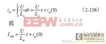 我们从(2-135)式以及图2-44还可以看出,当电源开关管Q1导通时,分布电容Cs两端电压μc也是励磁电感Lμ两端的电压,此电压由一个振荡波形与一个半波平均值Uc叠加,Uc≈U,因此,在Uc 的作用下,在励磁电感Lμ中有一个随着时间增长的线性电流通过,此电流大小为: