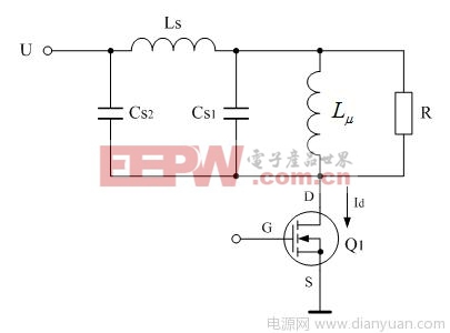 根据(2-140)式,分布电感Ls两端产生的反电动势将非常大;但实际上,在分布电感 产生反电动势的时候,它是可以通过分布电感两端的分布电容产生并联振荡的,因此,我们可以把图2-44电路进一步改进成如图2-46所示电路。 在图2-46中,Cs1、Cs2都是分布电容,它们对于分布电感 来说,既可以产生串联振荡,又可以产生并联振荡。在电源开关管Q1导通瞬间,分布电感与分布电容主要是产生串联振荡,因为输入电压开始向串联振荡回路提供能量;在电源开关管Q1关断瞬间,分布电感与分布电容主要是产生并联振荡,因为分布电感Ls必须要通过并联回路释放能量。在实际应用中,分布电感Ls相对于励磁电感Lμ来说很小,因此,如果不考虑分布电感Ls 的作用,完全可以把Cs1、Cs2看成是一个分布电容。 由于在变压器线圈中,分布电容和分布电感是由非常多的电容和分布电感互相串、并联在一起组成,如要严格地用集中参数完全把它们等效是很难的。至于等效电路是采用串联还是并联,这主要看它在电路中所起的关键作用。例如,在电源开关管接通时,串联电容的作用是主要的;而在电源开关管关断时,并联电容的作用反而是主要的。 当电源开关管Q1关断瞬间,分布电感Ls产生反电动势将会在分布电感 、Cs1、Cs2组成的LC回路中产生并联振荡,并联振荡回路电容由Cs1和Cs2串联而成,Cs1和Cs2的大小以及比例关系,与变压器线圈的结构有关,线圈的层数越多,串联电容的容量就越大。 从图2-45-c以及(2-140)式还可以看出,分布电感Ls以及励磁电感Lμ产生的反电动势,其幅度一般都等于或大于输入电源电压的幅度(假设占空比等于0.5),即加到电源开关管D极的电压最高可达输入电压的两倍以上。这是因为电源开关管的关断时间一般都很短,而分布电感释放能量时等效负载电阻很大的缘故。因此,如果不对电源开关管采取保护措施,反电动势很容易就把电源开关管击穿。 根据(2-140)式,降低分布电感反电动势幅度的最有效方法是减小负载电阻RL的阻值。除此之外,还可以在谐振回路接入一个由电阻、电容并联,然后与整流二极管串联的反电动势限幅电路,来对分布电感以及励磁电感产生的反电动势进行限幅,如图2-47所示。 图2-47 对分布电感以及励磁电感产生的反电动势进行限幅 在图2-47中,当电容器C1充上一定的电荷之后,其作用就相当于一个稳压二极管,不过这个稳压二极管的稳定电压值是动态的,它会随着反电动势的幅度升高而升高,而整流二极管D1的作用就相当于一个限幅二极管。当反电动势的幅度高于电容器C1两端的电压时,整流二极管D1就导通,反电动势就会向电容器C1充电,使变压器初级线圈的分布电感存储的能量向电容器转移,从而起到降低反电动势幅度的作用,与此同时电阻R1也会吸收一部份能量,使反电动势的幅度进一步降低。 电容器C1在吸收反电动势能量的过程中,其两端电压也会提高,但它可以通过R1进行放电,使电容器两端的电压基本保持在一个合理的范围。即:电容器C1在吸收反电动势的能量是有条件的,只有反电动势的的幅度超过某个值之后,它才开始吸收。正确选择RC放电的时间常数,使电容器在下次充电时的剩余电压刚好略高于方波电压的幅度,而电容充满电的幅度又低于开关管的耐压幅度,此时电源的工作效率最高。 以上我们对开关变压器的工作原理做了的比较详细的分析,但对于要设计一个实际电路中使用开关变压器来说,上面这些这些知识还远远不够,因此,后面我们还会用很大的篇幅来对开关变压器参数设计加以说明。因为,在具体电路中各种开关变压器的技术要求或参数都是不一样的,更多的内容留待我们后面进行具体电路设计时再详细介绍。