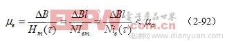 (2-92)式中, μe为变压器铁芯的有效导磁率;?B为磁感应强度增量; Hm(τ)为变压器铁芯表面的最大磁场强度;N为电感线圈匝数; l变压器铁芯的平均磁回路长度; Iem为涡流损耗折算到变压器线圈中的电流与最大励磁电流之和,Iem=i(τ) ,即:涡流损耗折算到变压器线圈中的电流励磁电流之和ie 在t = τ时刻的电流值; μa为变压器铁芯的平均导磁率。