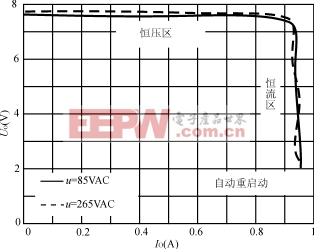 (1)当u=85VAC或265VAC时,特性曲线变化很小,这表明输出特性基本不受交流输入电压变化的影响;