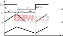 图3所示的电路中,电感L1工作在DCM模式,电感L2工作在CCM模式,其主要的波形如图4所示,这时,电路有三种工作状态,分析如下: