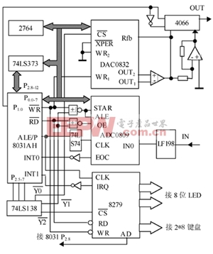 系统采用8031作为CPU,外扩8K的EPROM2764,用于存放监控程序、推理控制、键控及显示程序。扩展一片DAC0832,以便输出阶梯正弦波,其片选信号CS接74LS138的Y0口,选通地址为#1FFFH。DAC0832按单缓冲工作方式,使输入寄存器处于锁存状态,ILE接+5V,WR1接CPU的写信号WR,DAC寄存器处于不锁存状态,所以将WR2和XFER直接接地,DAC0832接成单极性输出,参考电压为+5V,输出0~5V的电压。