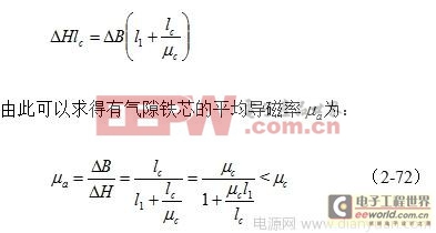 这里特别指出:(2-73)式给出的结果,是在初步满足磁通密度增量要求的条件下,求有气隙铁芯的平均导磁率μa 最大值的条件;当然是气隙长度越小,平均导磁率μa 就越大。但在实际工作中, μa的值要小于此值,因为,对气隙长度要预留一定的余量,变压器铁芯的工作点不可能让永远工作在最佳值的边沿;因此,实际工作中的变压器铁芯,其最大磁通密度增量△B 和最大磁场强度增量△H 都会超出(2-73)式给出条件的范围;所以,由(2