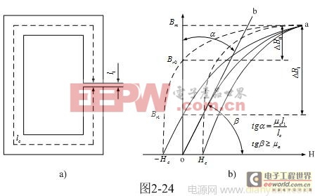我们再来看图2-24-b。在图2-24-b中,虚线表示变压器铁芯没有气隙时的磁滞回线,实线表示变压器铁芯留有气隙时的磁滞回线,其中磁化曲线o-a为留有气隙铁芯的基本磁化曲线。这里的基本磁化曲线与初始磁化曲线并不完全相同,这里的基本磁化曲线相当于磁化曲线的几何平均值,以便用于分析磁场强度增量 △H 与磁感应密度增量 △B 的关系。