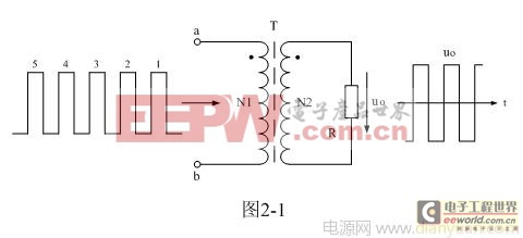 为了简单起见,我们把单激式变压器开关电源等效成如图2-1所示电路,其中我们把直流输入电压通过控制开关通、断的作用,看成是一序列直流脉冲电压,即单极性脉冲电压,直接给开关变压器供电。这里我们特别把变压器称为开关变压器,以表示图2-1所示电路与一般电源变压器电路在工作原理方面还有区别的。