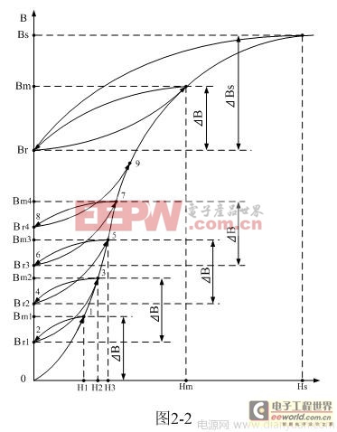 在变压器铁芯中,磁通密度B或磁通Φ 受磁场强度H的作用而发生变化的过程,称为磁化过程;因此,用来描述磁通密度B与磁场强度H之间对应变化的关系曲线,人们都把它称为磁化曲线。图2-2是单激式开关变压器铁芯被磁化时,磁通密度B与磁场强度H之间对应变化的关系曲线图。