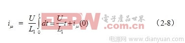 (2-8)式中, iμ为流过变压器初级线圈的励磁电流,E为加到变压器初级线圈两端的电压,L1为变压器初级线圈的电感量,t为时间, iμ(0)为初始电流,即t = 0时流过变压器初级线圈的励磁电流。
