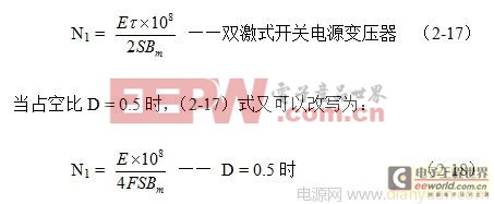 (2-17)和(2-18)式,就是计算双激式开关电源变压器初级线圈N1绕组匝数的公式。式中,N1为变压器初级线圈N1绕组的最少匝数,S为变压器铁芯的导磁面积(单位:平方厘米),Bm为变压器铁芯的最大磁通密度(单位:高斯),τ为脉冲宽度,或电源开关管导通时间的宽度(单位:秒),E为脉冲电压的幅度,即开关电源的工作电压幅度,单位为伏,F为开关电源的工作频率,单位赫兹。