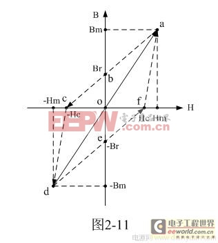 在图2-11中,直线d-o-a是变压器铁芯的理想磁化曲线;当输入电压为交流的时候,磁通密度是从负的最大值- Bm到正的最大值Bm之间来回变化。