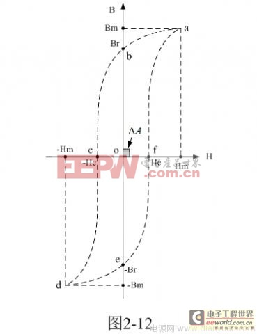 当第一个交流脉冲的负半周电压结束的时候,磁场强度为0,但磁通密度并不等于0,而是沿着另一条新的等效磁化曲线d-e下降到e点,即剩余磁通密度-Br处。待输入脉冲的正半周电压到来时,磁通密度再由-Br沿着等效磁化曲线e-f上升到0,然后继续沿着等效磁化曲线f-a上升到达a点,对应的磁场强度为Hm,磁通密度为Bm。