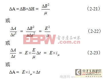 (2-21)、(2-22)、(2-23)、(2-24)各式是完全等同的。(2-21)、(2-22)、(2-23)、(2-24)式中,ΔB为磁通密度增量,ΔH磁场强度增量, μ为导磁率,Δt为时间增量,或单位时间;E为单位长度导线产生的感应电动势,E = ΔB/Δt ; iμ为励磁电流,它与输入电压、变压器铁芯的导磁率、脉冲宽度的大小有关,iμ=E*Δt/μ ;由于 的单位为亨/米(单位长度导线的电感),因此,我们把它看成是一个单位长度导线的电感。