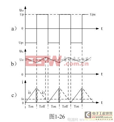 图1-26中,uo是变压器次级线圈输出波形,Up是变压器次级线圈输出电压正半周波形的峰值,Up-是变压器次级线圈输出电压负半周波形的峰值,Upa是变压器次级线圈输出电压波形的半波平均值,uc是储能滤波电容两端的电压波形,Uo是反激式变压器开关电源输出电压的平均值,i1是流过变压器初级线圈的电流,i2是流过变压器次级线圈的电流,Io是流过负载两端的平均电流。