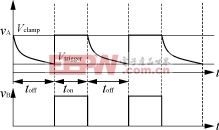 固定关断时间控制的电路图如图1所示。如果一种控制芯片的工作频率可以自动调整,另外,它的某个管脚有一个高的钳位电压(Vclamp)和一个低的触发电压(Vtrigger),再利用芯片的PWM信号就可以实现固定关断时间控制。我们把具有这样特性的管脚定义为管脚A,输出PWM信号的管脚定义为管脚B。下面介绍这种固定关断时间控制方法的工作原理。