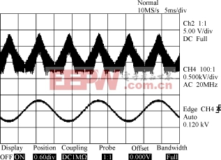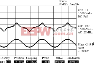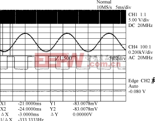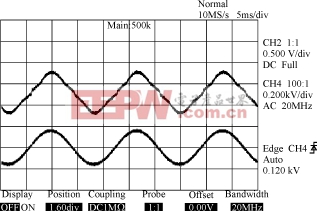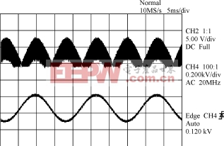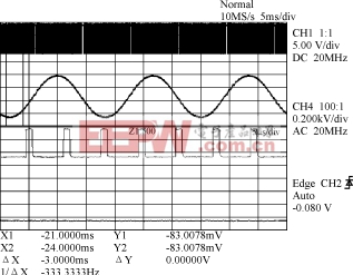 本文以L6562为核心设计了一种固定关断时间的新颖PFC电路,它的主要特点就是固定了MOSFET的关断时间。在这种控制方法下,当输入电压过零点附近时电路以DCM模式工作,在输入电压峰值附近时电路以CCM模式工作。实验证明实现了固定关断时间控制。图3和图4分别给出了在电压过零和峰值附近时的PWM驱动信号波形;图5和图6分别给出了输出满载时,在输入电压为115V和230V时的电感电流波形;图7和图8分别给出了输出满载时,在输入电压为115V和230V时的输入电流波形。实验结果表明,在整个输入电压范围之内,实现了固定关断时间控制。