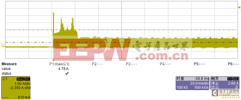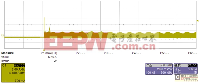 这是在启动的时候抓的三极管的电流波形,大家可以看到,在启动的一刹那,通过三极管的电流的值很大,等灯亮了以后,电流就小了,问大家一个问题,在启动时,为什么三极管电流很大?为什么三极管的电流上有纹波调制的?哪里来的?