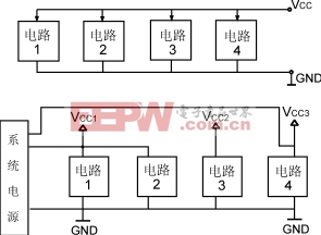 图2是集中供电和分布式供电的电源连接示意图,其中图2(a)是集中供电方式,图2(b)是分布式供电,电路1~电路4是同一系统中的4个部分。图(a)中4个部分共用1个电源,而图(b)中4个电路用了3个电源,其中Vcc1和Vcc3由系统电源提供,Vcc2是系统电源之外的单独电源。