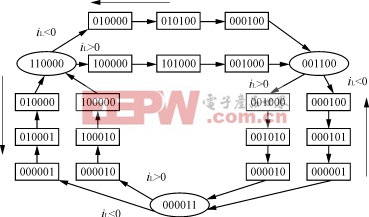 相的三个双向开关状态转换图。1表示为开关导通,0表示开关关断,前两位、中间两位和后两位分别表示与三个输入相连的双向开关。图中,椭圆形框表示稳态,矩形框表示暂态。可见,要正确实现四步换流需要知道当前状态、下一时刻状态、负载电流方向及定时器换流时间,判断得出正确的换流信号和顺序并输出到每个IGBT器件的栅极,完成换流所需的时序逻辑。