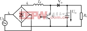 开关电源的功率因数校正器(PFC)可分为两类,一类为有源PFC,由电感电容及电子元器件组成;另一类为无源PFC,一般采用电感补偿方法使交流输入的基波电流与电压之间相位差减小来提高功率因数。在校正电路中有源PFC较多采用高频升压电路功率因数开关调节器,通常采用Boost电路,基本电路拓朴见图1。