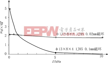 列如1J79,1J851系列,μo≥5×104。在选择金属磁性材料时必须注意频响问题(见图3)1J79或1J851系列的磁心μo随频率上升而下降的幅度比较大,越薄的材料,μo随频率下降的幅度比较小,设计时应注意这一点。