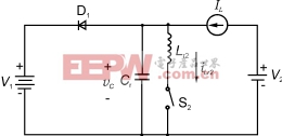 在t=0时开关S1导通之前,续流二极管D2导通。因此谐振电容Cr上的电压vC在这一阶段等于V2。