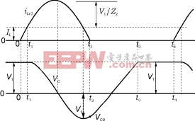同时,电容上Cr的电压也是一正弦函数。当t=t2时,电容上的电压vc相应的电压值Vco为: