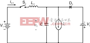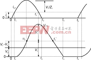由于续流二极管D2的存在,电容电压vc不能减小至负值。当t=t3时,负载电流不再流经Cr,而是流经D2。从这时起,续流负载电流流过主电感L、负载电源V2和续流二极管D2。这一阶段的时间长度(t4-t3)取决于设计要求。若忽略功率损耗,且认为I2=IL,得出输入电流平均值I1为: