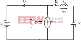 当t=0时开关S2导通,电容Cr上的电压等于电源电压V1。电感电流iLr2以斜率(V1+V2)/Lr2线性增加,但始终比负载恒定电流IL小。因此谐振电容Cr上无电流流过。当t=t1时,电感电流iLr2等于负载恒定电流IL,则t1为: